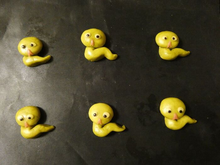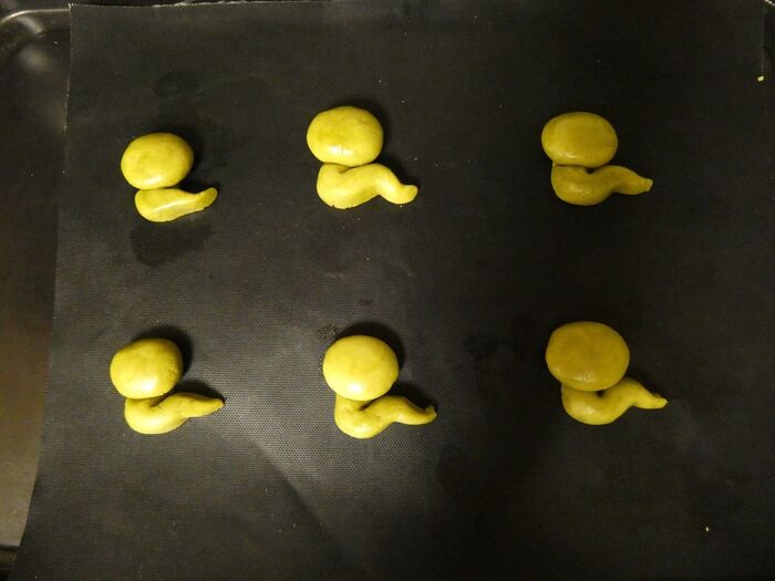 白色と黒色の生地で目をつけ、ピンク色の生地で舌をつけます。オーブン150℃で15~20分焼いて完成。