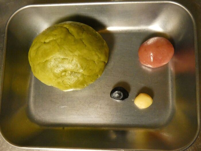 生地2gを取り分け白色のままにし、5g取り分けてクランベリーパウダーを混ぜ、2g取り分けブラックココアパウダーを混ぜます