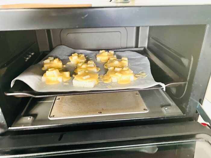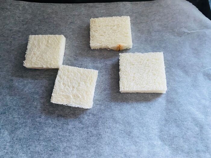 天板にクッキングペーパーを乗せ、カットした食パンを乗せます。