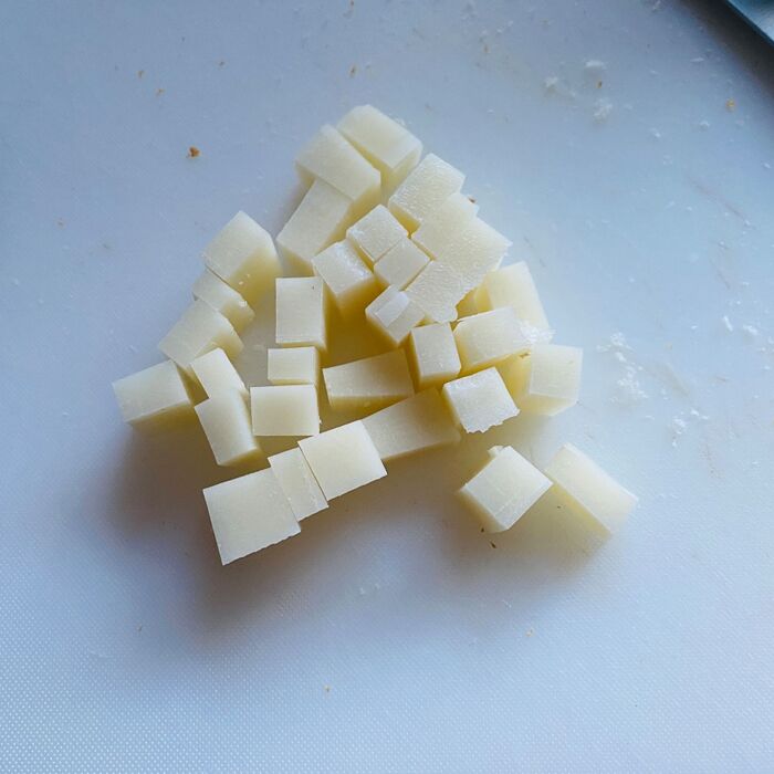 食パンにクッキー生地を乗せ、角切りにした角餅をパラパラ乗せます。
