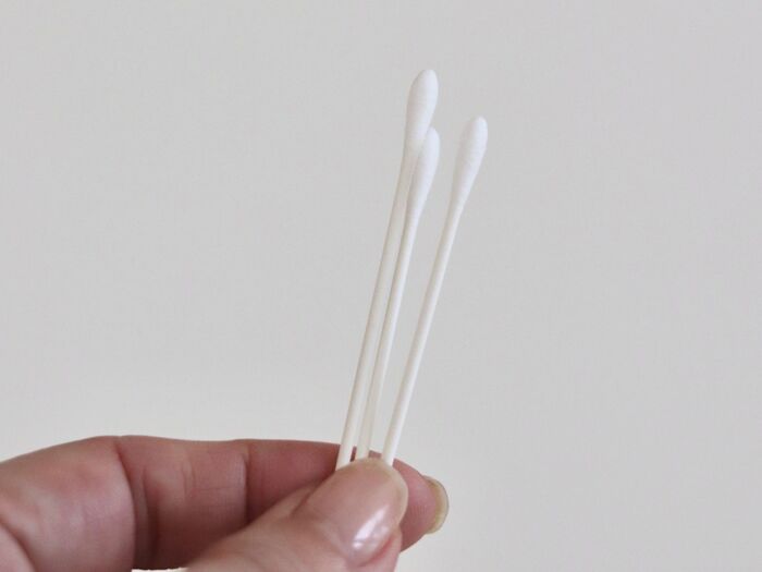ここでおススメの方法は綿棒を使うこと。乳液を手のひらに少量取ったら、綿棒の片方を浸します。綿棒を使うと乳液のつけすぎ防止だけでなく「パンダ目」など、細かい修正も簡単に。