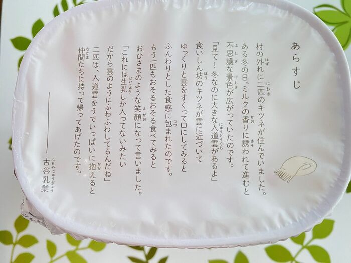 蓋を開けると、2匹のキツネがミルクの香りに誘われて、まるで入道雲のような生乳で作られたヨーグルトを食べたお話が描かれています。