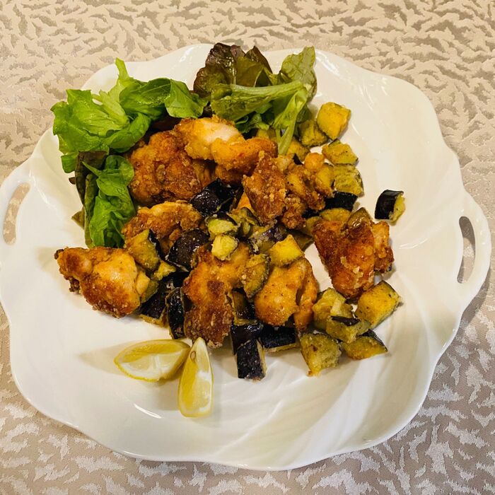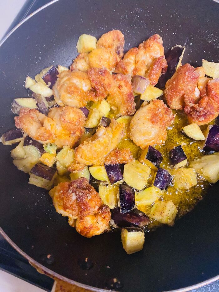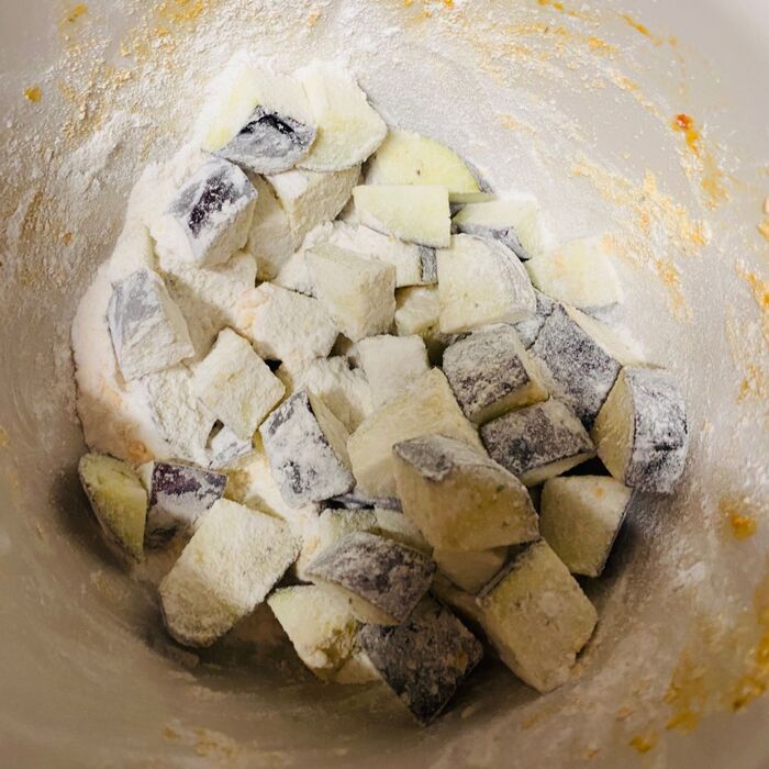 へたをとって、サイコロ切りにしたなすに米粉をまぶします。