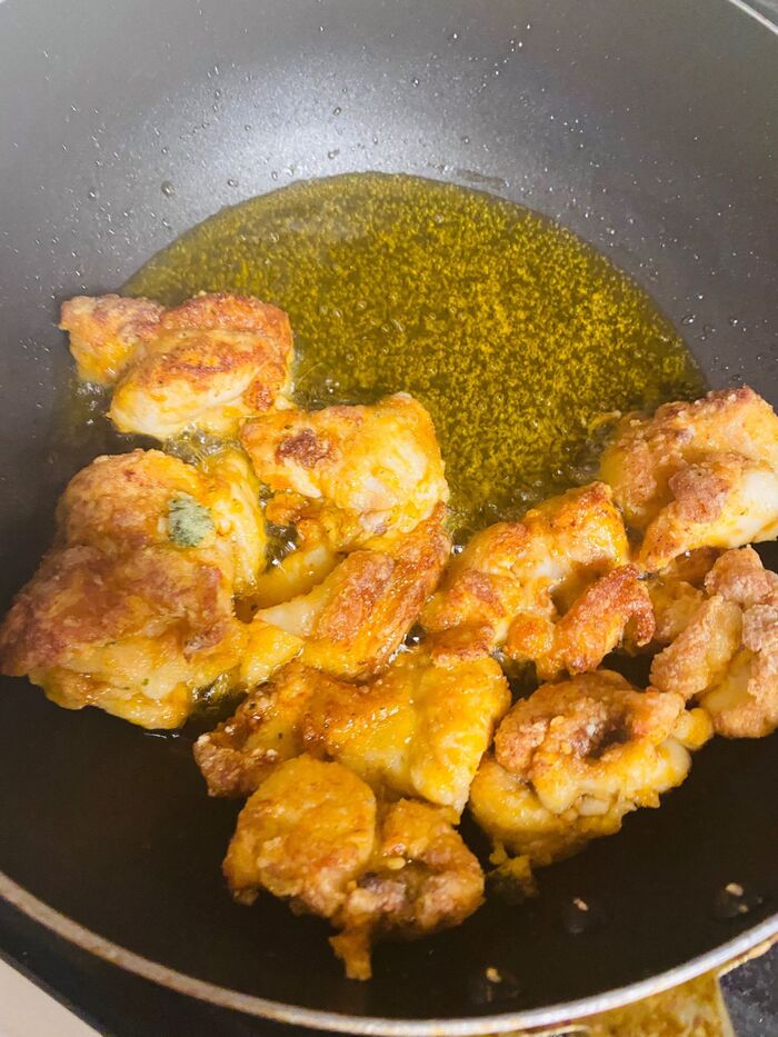 鍋に米油を入れ温めます。米粉をまぶした鶏もも肉を揚げ焼きします。
