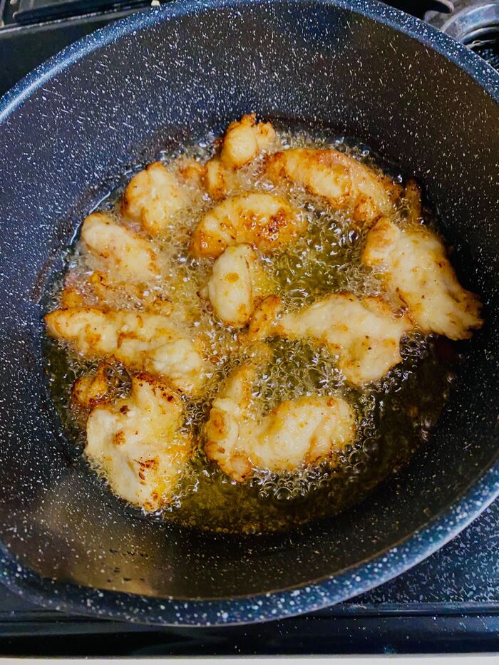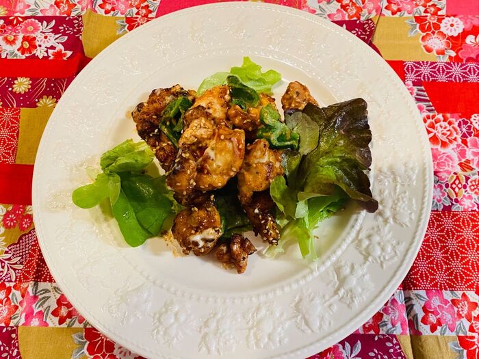 よく油を切って、オーロラソースにコチジャンを混ぜたものに絡めます。