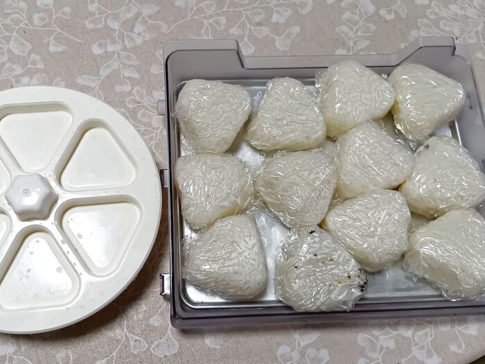 〇今回使用した便利グッズは、「おにぎりメーカー」(購入時の金額1380円)といいます。円形で、おむすびが6個できちゃうんです。丸い形で、見た目もいいかんじ。丸い形は、見た目だけでなく、尖ってなくて怪我しにくいし、重さも約166gととっても軽いんですよ。
