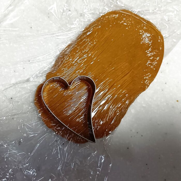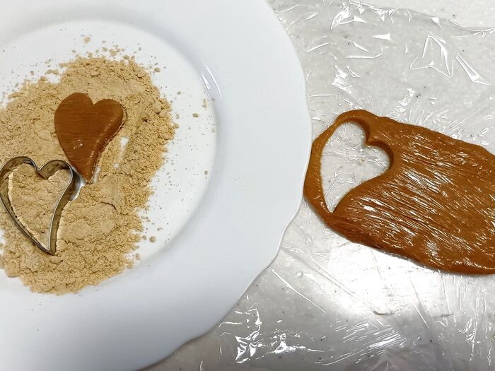 ③ ②をラップにのせ、12×7cmの大きさに伸ばします→長い部分が5.5cmのハート型3個を抜き取るためのサイズです。