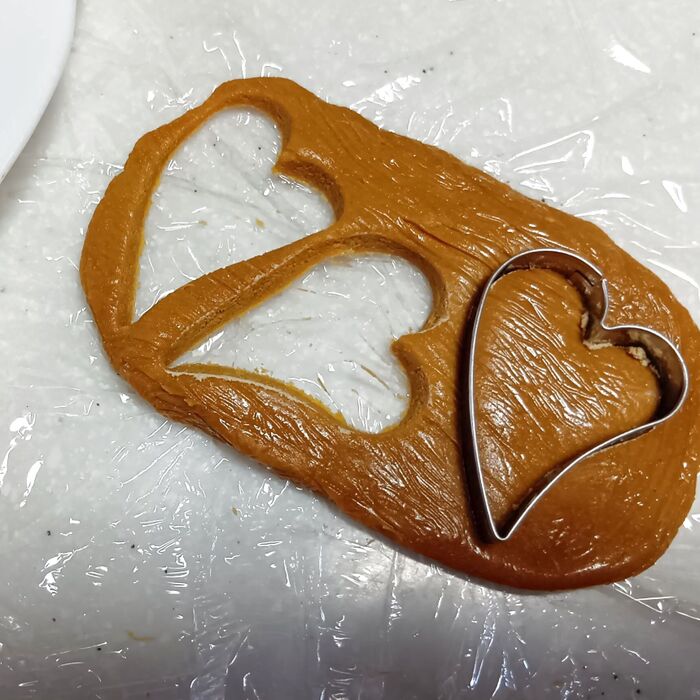 ④ 冷蔵庫で③を約15分冷やし、冷えたらハート型で3個抜き取ります。