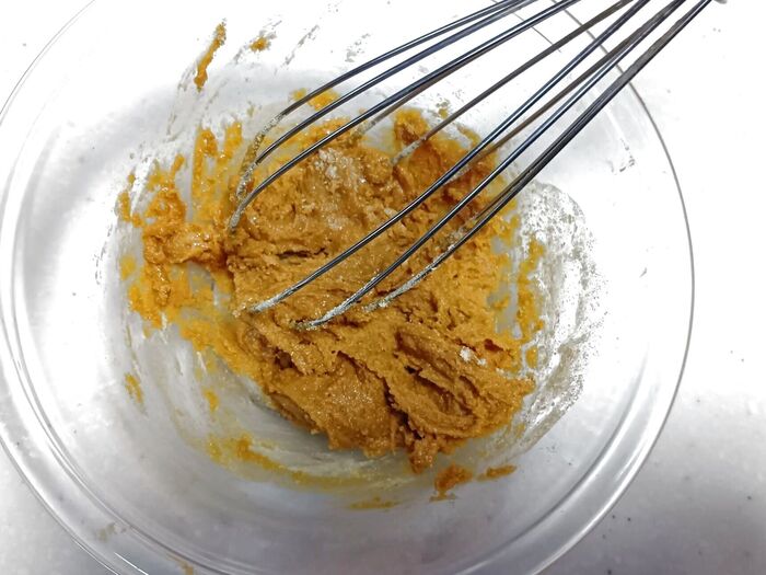 ② 500Wの電子レンジで30秒加熱し、すぐにきなこを加えてよく混ぜ合わせます。