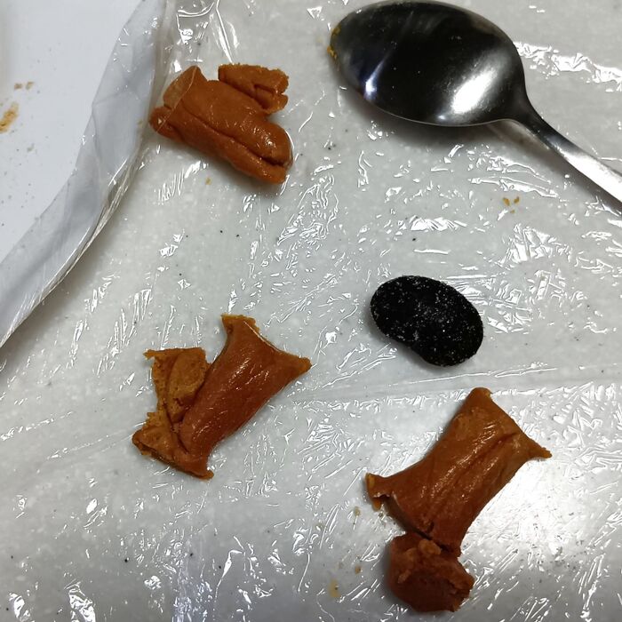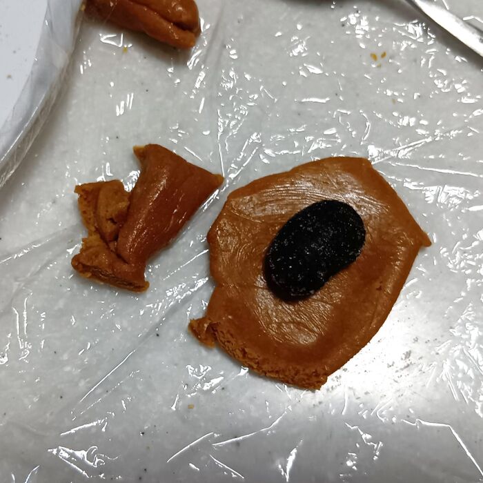 ⑥ 抜き取った余った生地で、丸いきなこ棒を作ります。生地を3等分にし、それぞれ丸く伸ばしてから甘納豆を包み込みます。