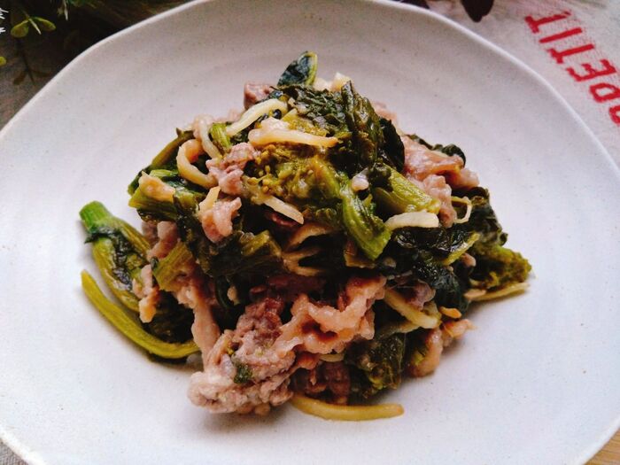 菜の花を戻し入れ、Bを加え絡めながら炒め合わせたら完成