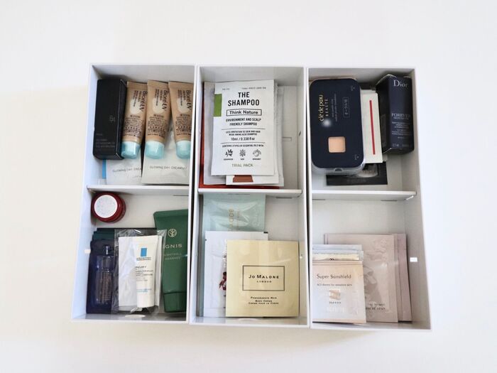 サンプルをまとめて紙袋などに入れてたとしても、化粧水・美容液・クリームなどがごちゃまぜになっていて、何がどのくらいいあるか分からない。