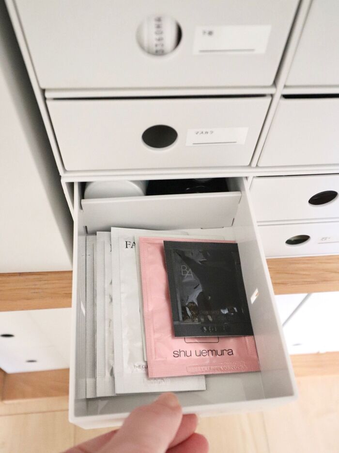 ルールを作っていて、夜はこの引き出しの中から必ず1つ、サンプルを使うんです。すると、使用後の肌変化も分かりやすいし、毎日ひとつ、サンプルが減ります。