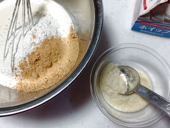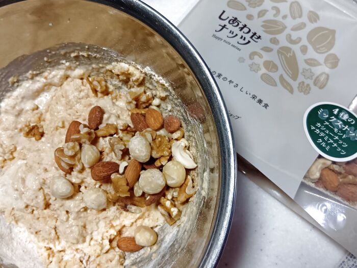② ミックス粉、きなこ、アーモンドプードル、3種類のナッツ類を加え、さらに混ぜ合わせます。