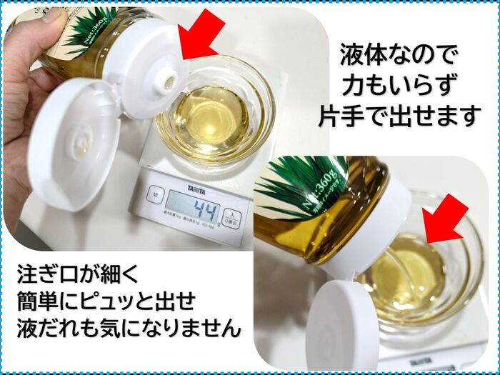 〇注ぎ口が細いのでピュッと出せ、量が調整しやすく、液だれも気にならない
