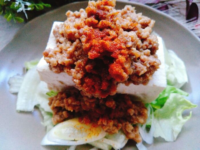 3.フライパンを熱してAをほぐしながら炒め豚肉に火が入ったらBを加え、とろみが付いたら豆腐の上にかけて完成。