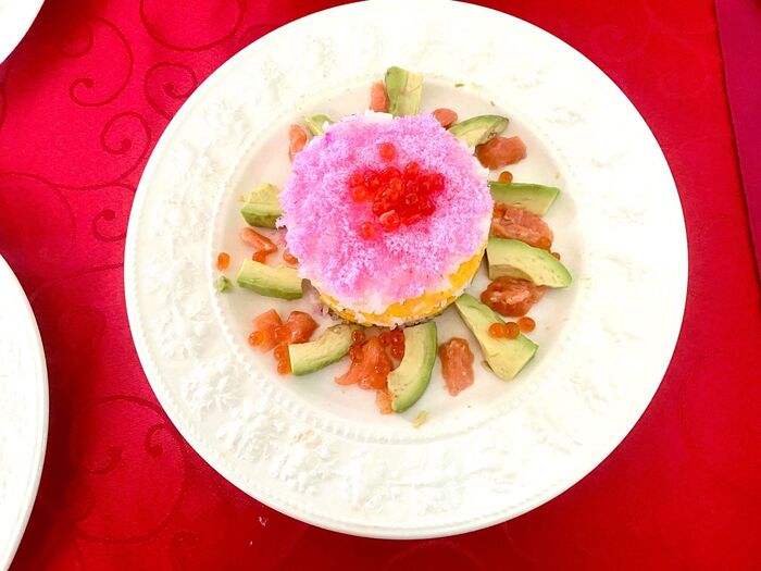 周りに、アボガドをスライスしたもの、サーモンを細く切って、クリームチーズで和えたものを飾ります。