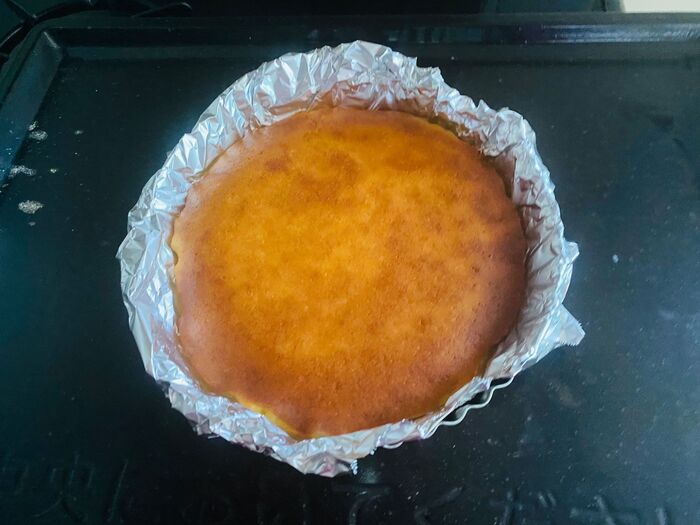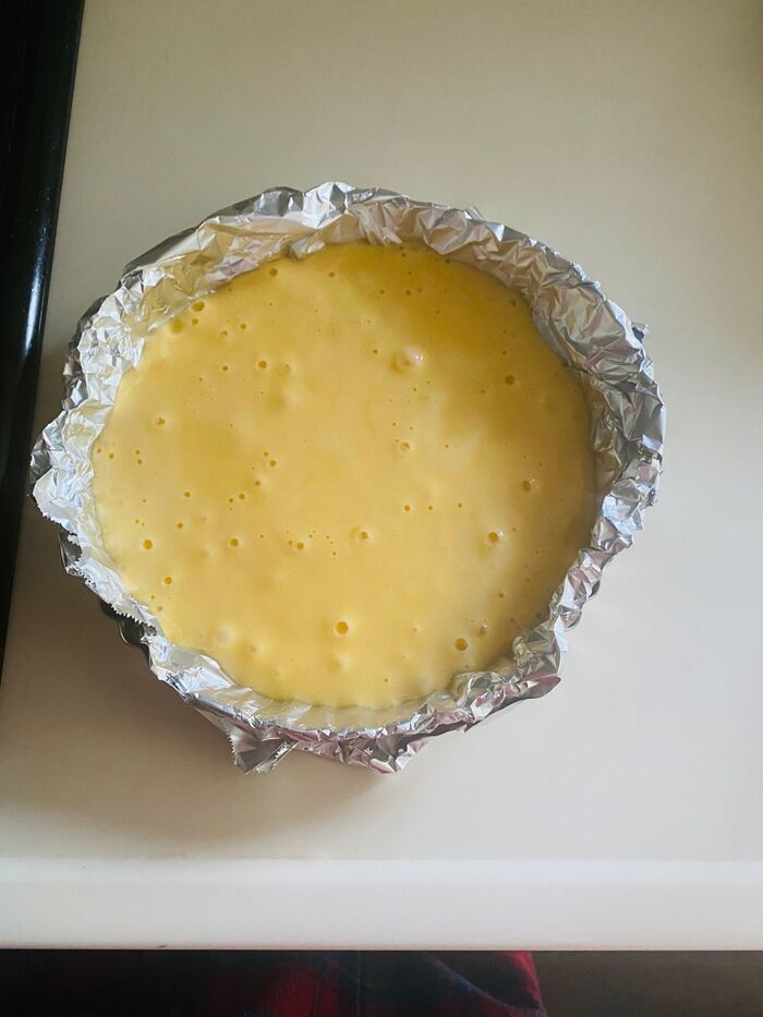 丸い型に、くっつかないアルミシートを敷き、生地を流し入れます。
