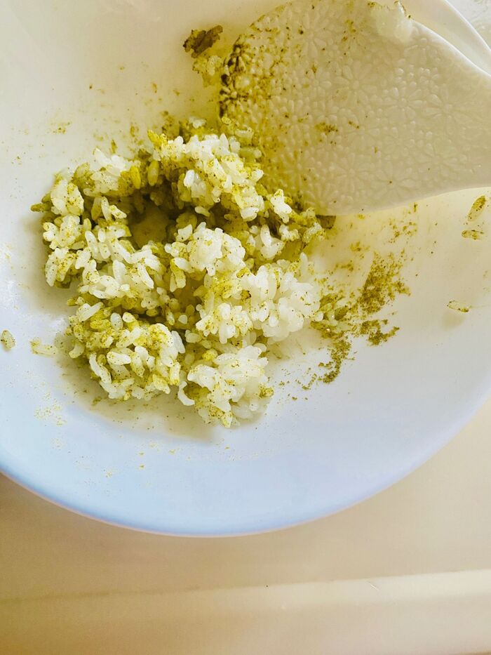 抹茶をふりかけ、よく混ぜます。