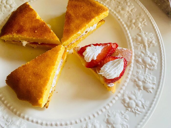 片側にホイップクリームを塗り、スライスした苺を乗せます。またホイップクリームを塗り、ケーキを乗せます。