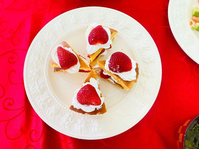 ホイップクリームと、半分にカットした苺を乗せ完成!