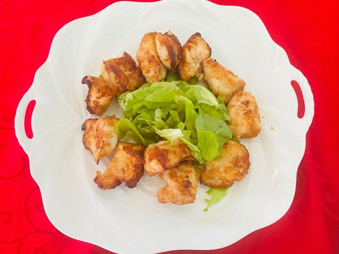 よく油を切り、器に盛り付け、水でささっと洗ったレタスを添えます。