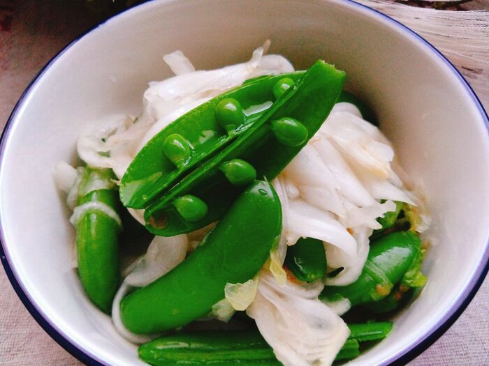 2.ボウルに玉ねぎ、スナップえんどう、かつおだしを入れてよく混ぜたら完成