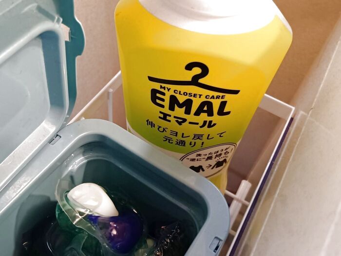 現在、よく使っているのは、ポイッと1個入れるだけの洗剤と、おしゃれ着洗い用のエマールなんですが、なんとこの2つの容器がシンデレラフィットしてくれるんです! ピッタリ収まるので、収納がさらにスッキリして、使い勝手も抜群です。