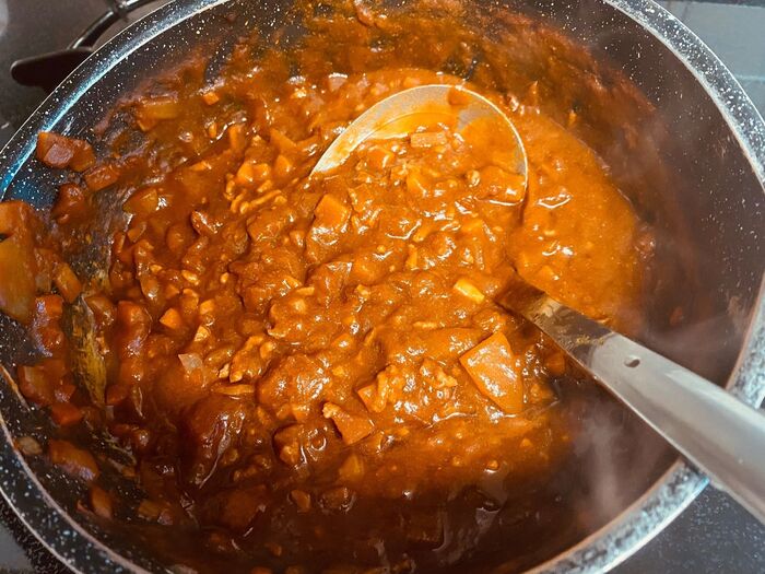 ハッシュドビーフルーを加え、よく煮溶かし、弱火で煮込みます。