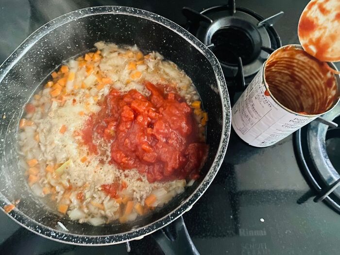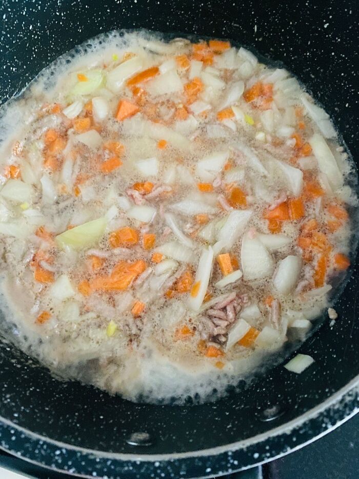 みじん切りにした人参、玉ねぎを入れ炒めます。