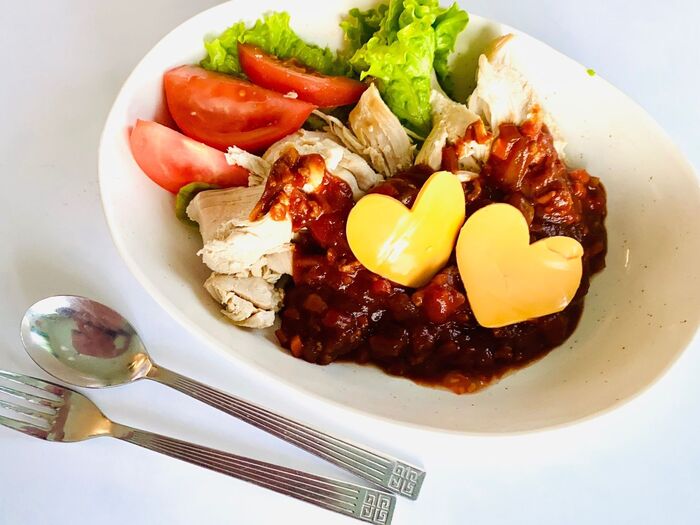 スライスチーズを、ハートのクッキー型で型抜きして、乗せます。