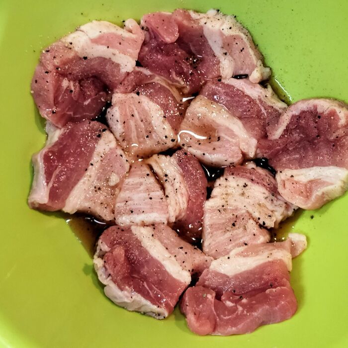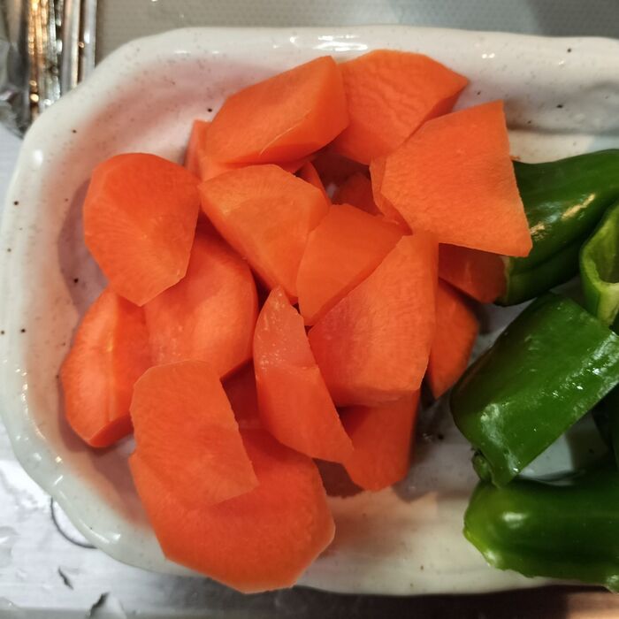 新玉ねぎ:皮を剥き、ピーマンと同じくらいの大きさに切る