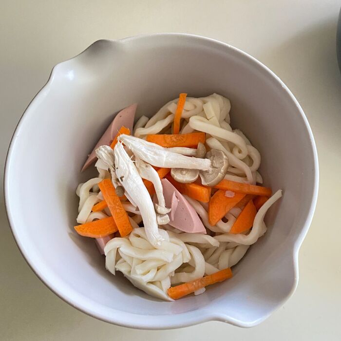 ボールに、せん切りにした人参や手で割いたしめじ、斜めせん切りした魚肉ソーセージ、ザクザクに切ったうどんを入れます。