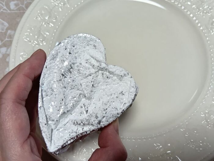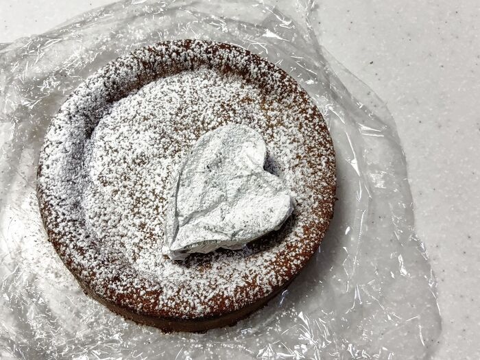 ガトーショコラの上にハート型を置いて、型の上から粉砂糖をふりかけます。