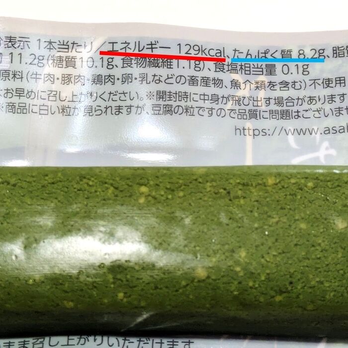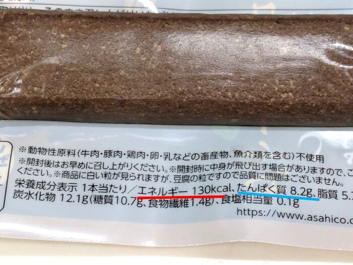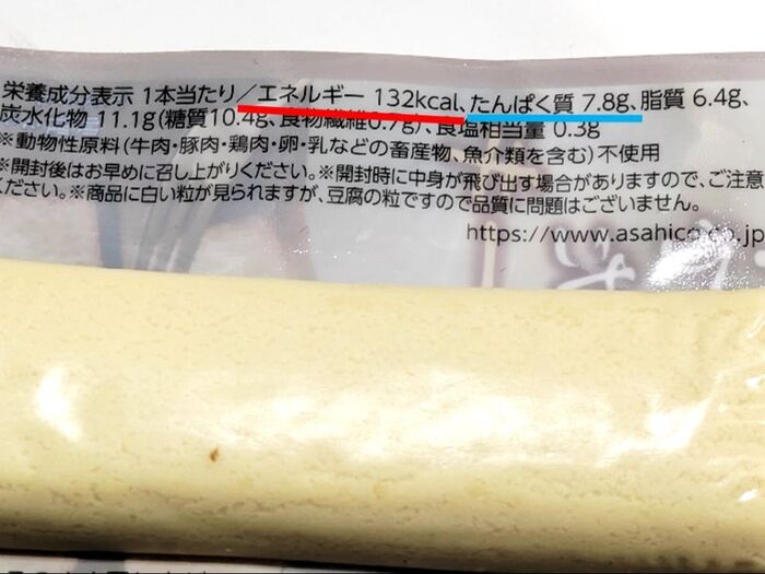 お豆腐でつくられているので、1本あたり130cal・たんぱく質8.2g。
