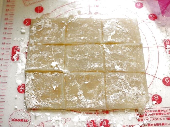 温かいうちにめん棒で伸ばして粗熱をとる。その後8等分にカットする(※写真では9等分になっていますが…)。横長に伸ばして、縦×横(2×4)の8等分になるように切るのがちょうどよいです。