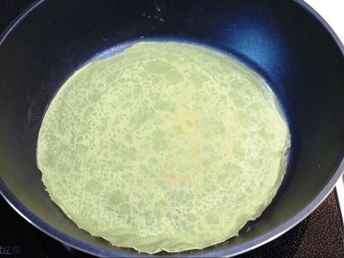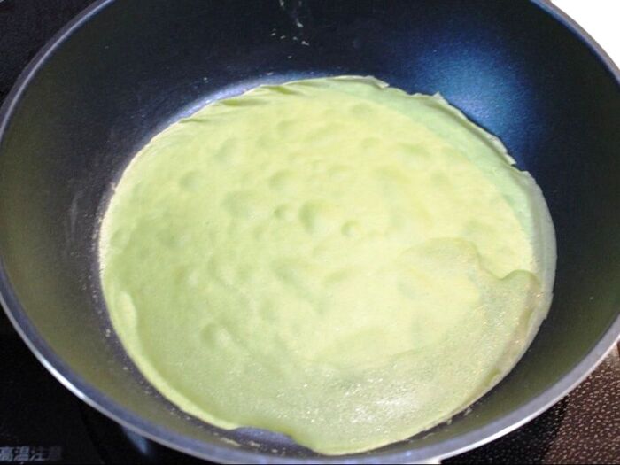 熱したフライパンで弱火~中火で焼く。おたまで1杯弱を流し、おたまの背でくるくる~と広げるとキレイに伸びます。