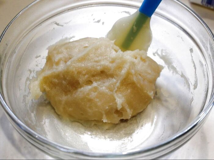 ラップをせず電子レンジ600Wで1分加熱。取り出してゴムべらで混ぜ、再び1分加熱。片栗粉をふったバットに移す。