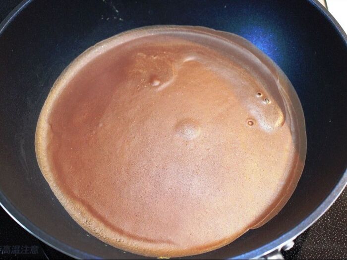 熱したフライパンで弱火~中火で焼く。おたまで1杯弱を流し、おたまの背でくるくる~と広げるとキレイに伸びます。