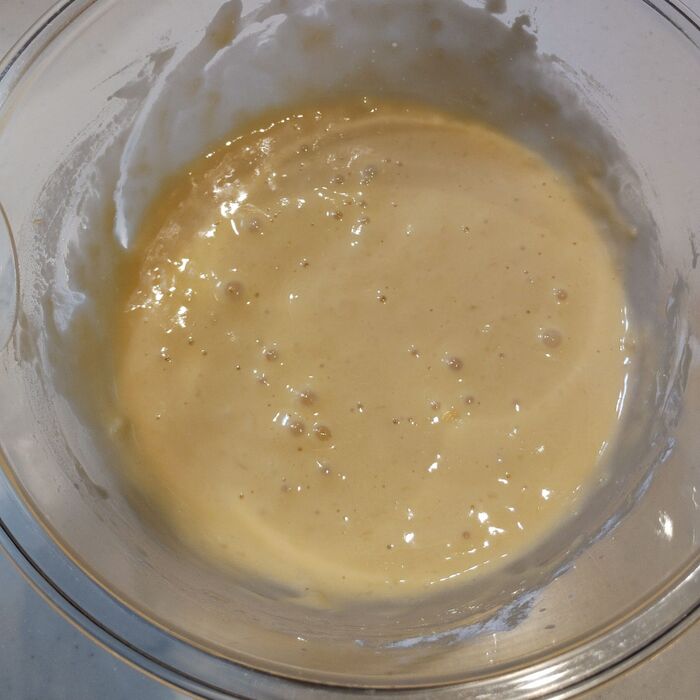 牛乳をレンジ600wで50秒加熱して温め、ちぎったチーズを入れて溶かし混ぜておく←粗熱をとっておく。そこへ卵と太白ごま油、砂糖を入れてホイッパーでよく混ぜる。