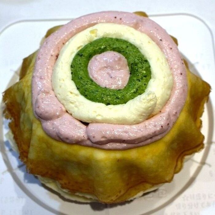 ベイクドチーズの土台に、中心から円状に緑→白→赤→緑と交互に絞り出したらクレープをのせて軽く押し密着させる。