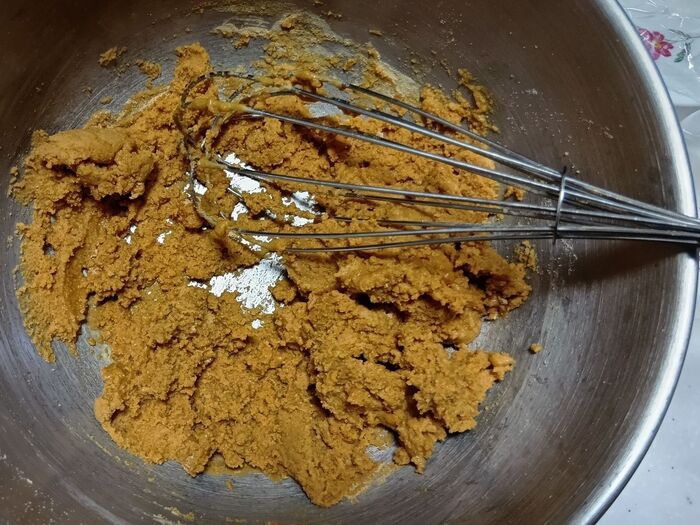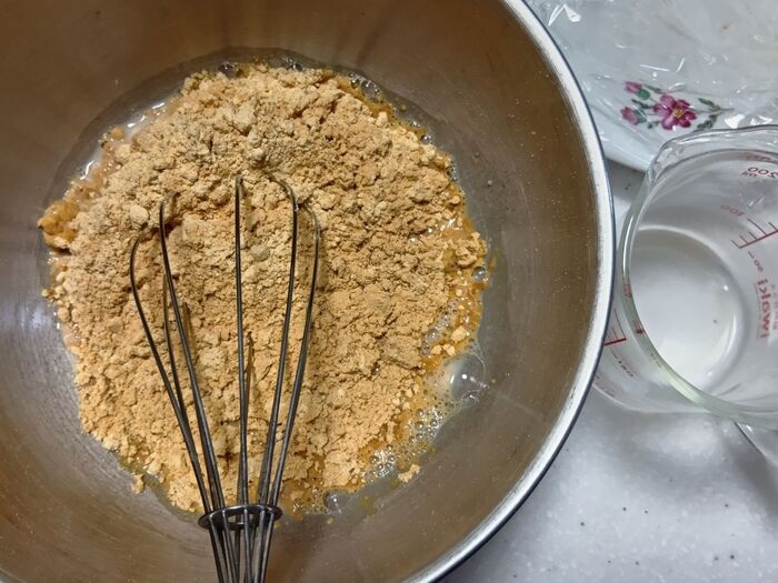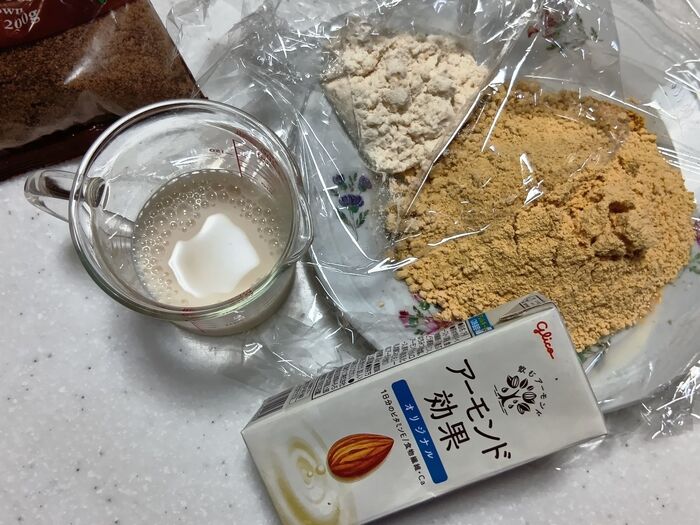 ①ボウルにきなこ、てんさい糖、アーモンドミルクを加え、泡だて器で混ぜ合わせます。