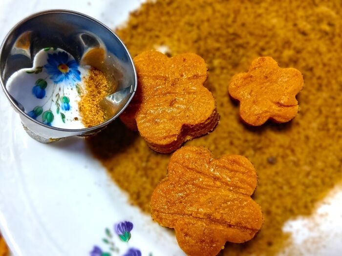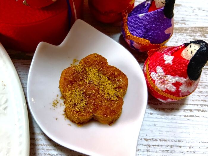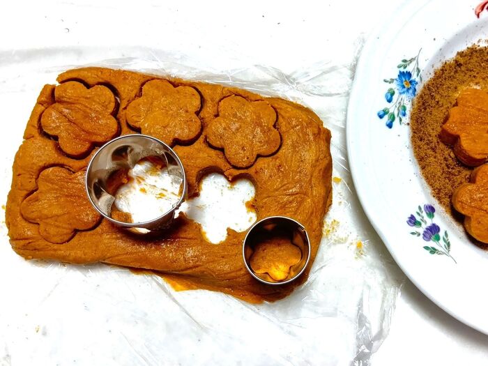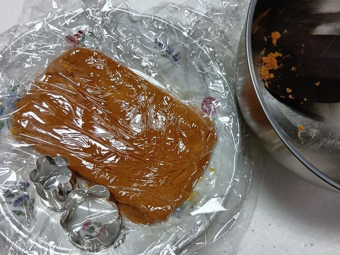 ③ 皿に黒糖をたっぷり入れておきます。冷蔵庫で寝かせた生地を取り出し、お花の形の抜型(2種類)で抜き取ります。余った生地はラップで包み、折りたたんでひとまとめにしてから再度抜き取ります。この作業を繰り返して、生地がなくなるまでお花の形に抜いていきます。