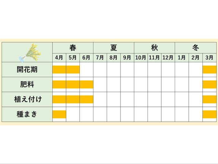 パールアカシアの開花期間 は3月から5月です。この時期になると、鮮やかな黄色い花が咲き誇り、庭を明るく彩ります。黄色い花は見ているだけで気持ちを元気にしてくれるでしょう。