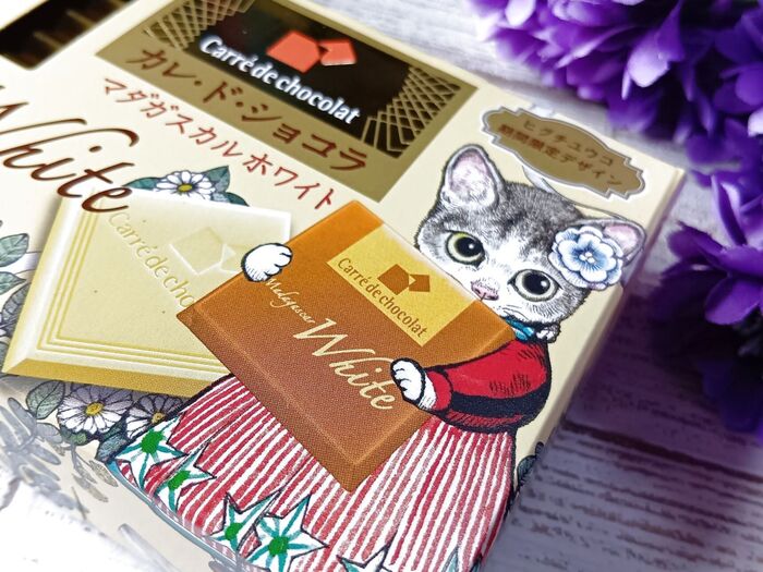 本品、カレ・ド・ショコラ (カカオ70 マダガスカルホワイト フレンチミルク)には、ヒグチユウコさんの絵本から、「ピノ」「ボーちゃん」「こはる」が描かれているとのこと。