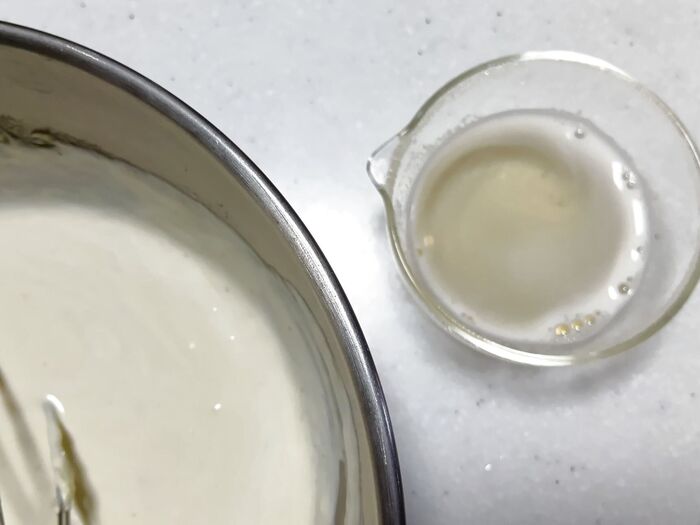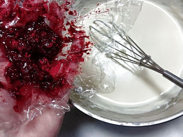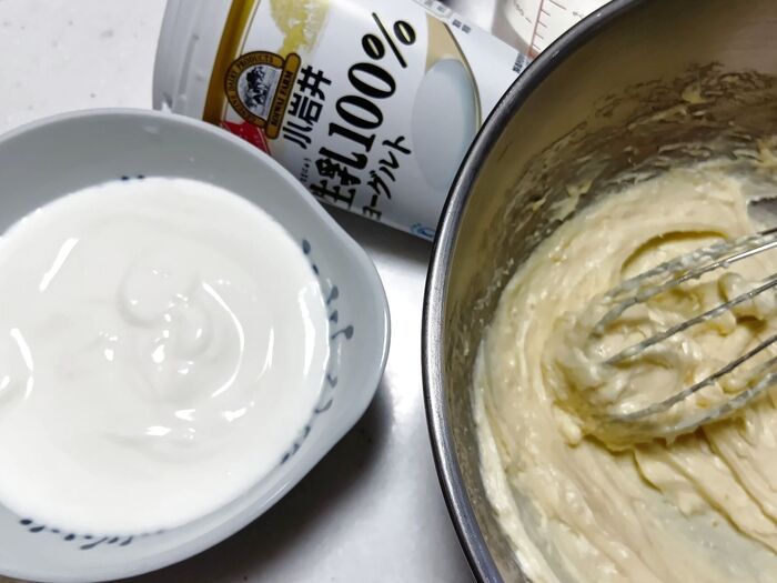 ⑤ ヨーグルトを数回に分けて加えながら混ぜ、生クリームも加えてよく混ぜます。
