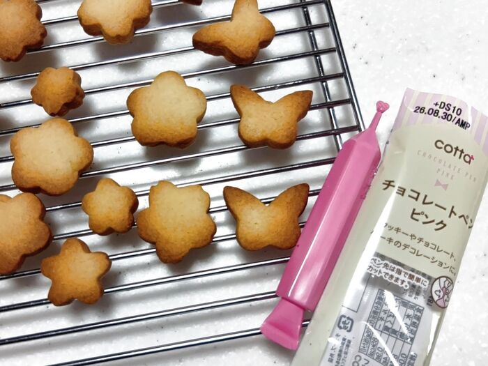 ① ひなまつりにぴったりのモチーフ型でクッキー生地を5~7mmに抜きます。 170度に予熱したオーブンで15分焼き、しっかり冷ましてからピンクのチョコペンでデコレーションします