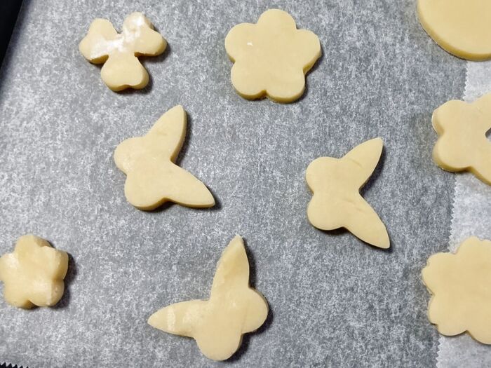•クッキー生地は以前作って冷凍保存していたものです。常温で柔らかくしたら、強力粉を打ち粉にして、ひなまつりモチーフで型抜きします。