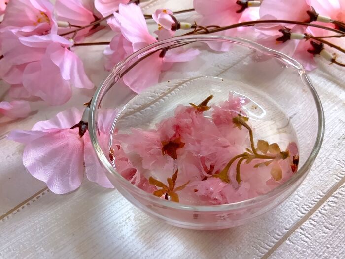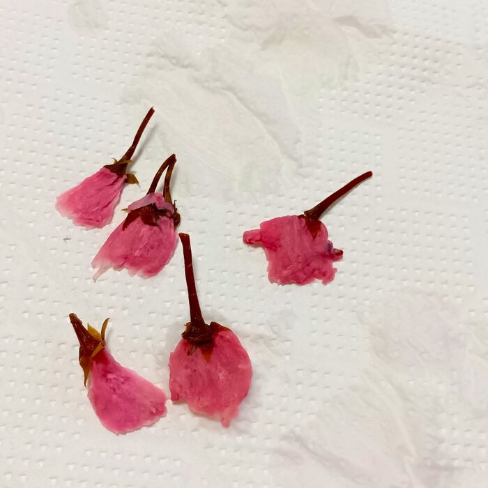 ②桜の塩漬けは水に浸して塩を抜きます。 軽く押して水分を取り除いたら、キッチンペーパーに挟んでさらに水気を取りながら形を整えます。
