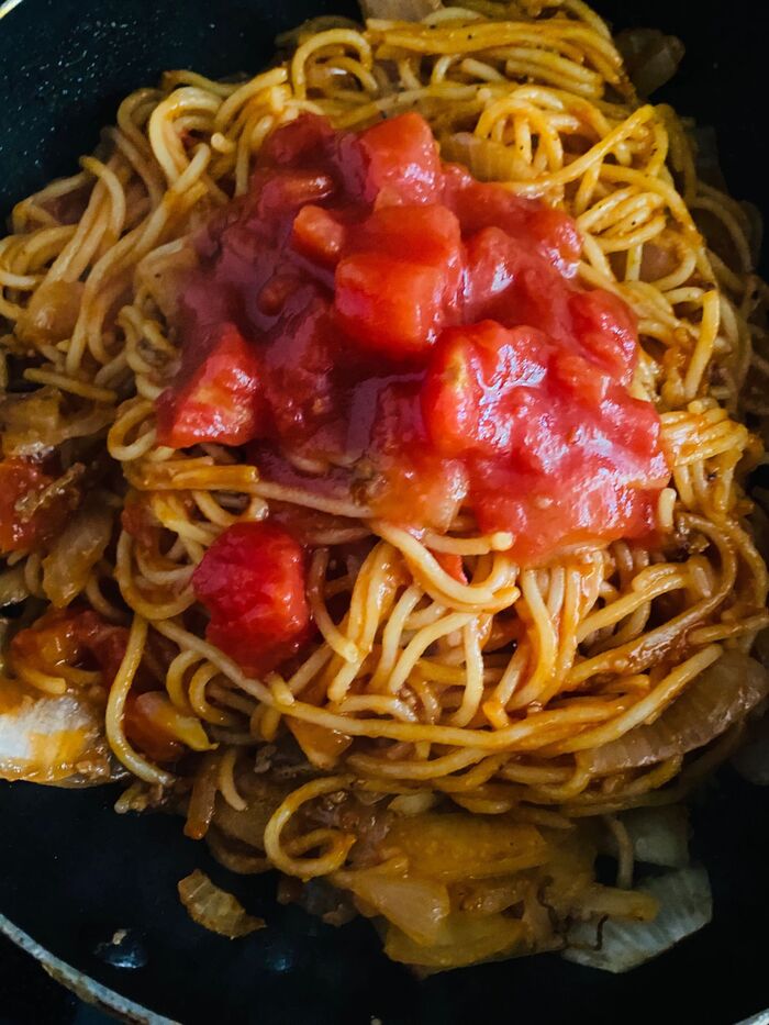 フライパンにオリーブオイルを入れ、玉ねぎ、ニンニク、挽肉を炒めて、茹でたパスタを入れよく炒めます。トマト缶、トマトケチャップ、塩胡椒で味付けします。
